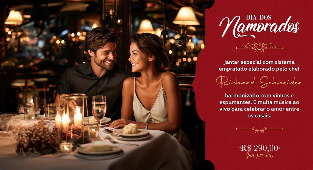 O Jantar Especial dos Namorados, com menu exclusivo criado pelo Chef Richard Schneider, será servido no elegante sistema empratado, conceito que leva os pratos elaborados e decorados das mãos do chef diretamente à mesa, numa sequência que vai desde entradas até as sobremesas. Ele inclui harmonização com vinhos e espumante para o brinde especial, água, sucos e refrigerantes.